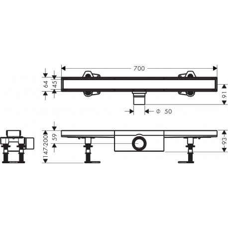 Kompletná žľab Hansgrohe RainDrain Compact 700, rošt do wyłożenia płytkami, štandardný