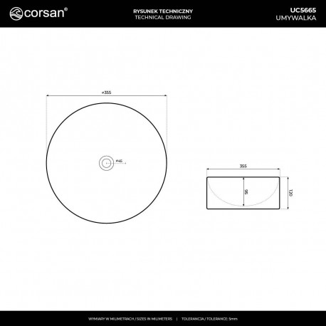 Corsan > Sanitárna keramika > Umývadlá na dosku > Umywalki nablatowe > Umývadlo na postavenie na dosku Corsan Lugo okrúhla 35,5x12 cm s uzáverom klik-klak bielym